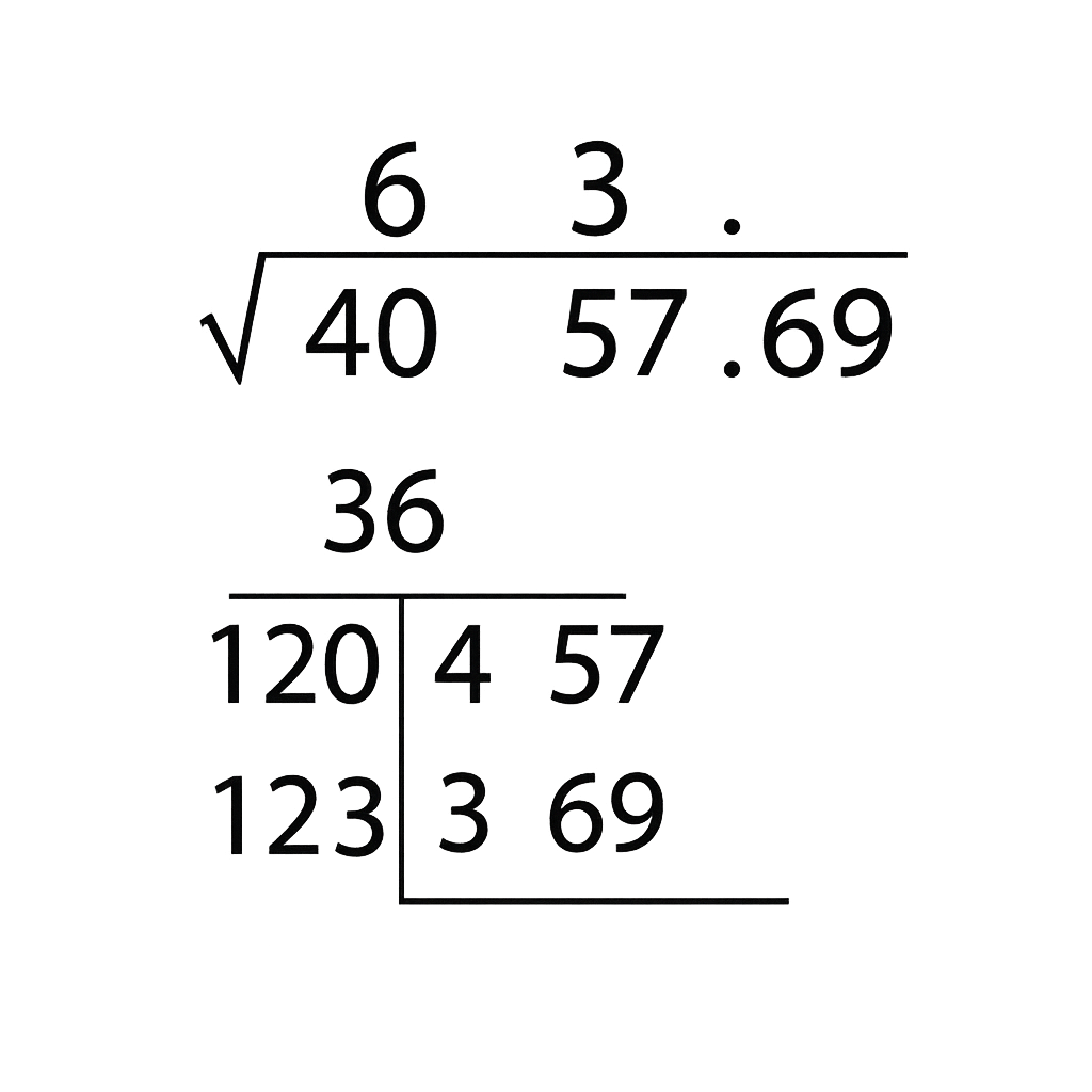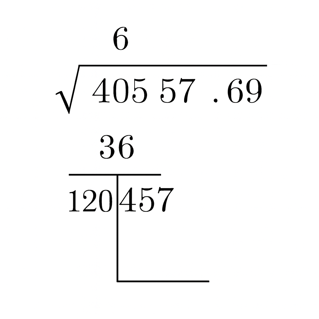 5. Divide the remainder in step 2 (457) by your result in step 3 (120) just to get an integer value. Do three things with that quotient, 3: (1) place that 3 as the next digit in your answer, (2) add that 3 to your divisor (120) to get 123, and multiply that sum by the 3, placing the product, 369, below the remainder.
