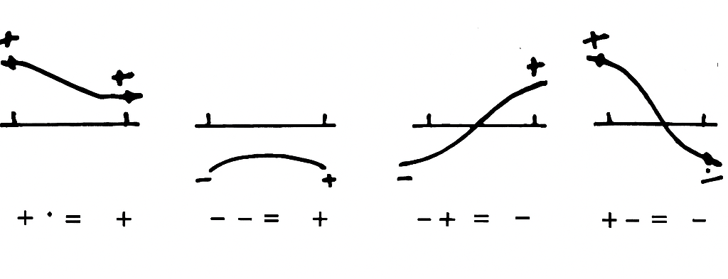 I remind you of those rules for products of integers (often called informally “products of signed numbers”): When multiplying two factors, if the signs of the factors are the same, the product is positive; if the signs are different, the product is negative. Some (hopefully familiar) examples: −3 × −5 = +15, −3 × 5 = −15, 3 × 5 = 15 and 3 × −5 = −15. This is summarized in the following table.