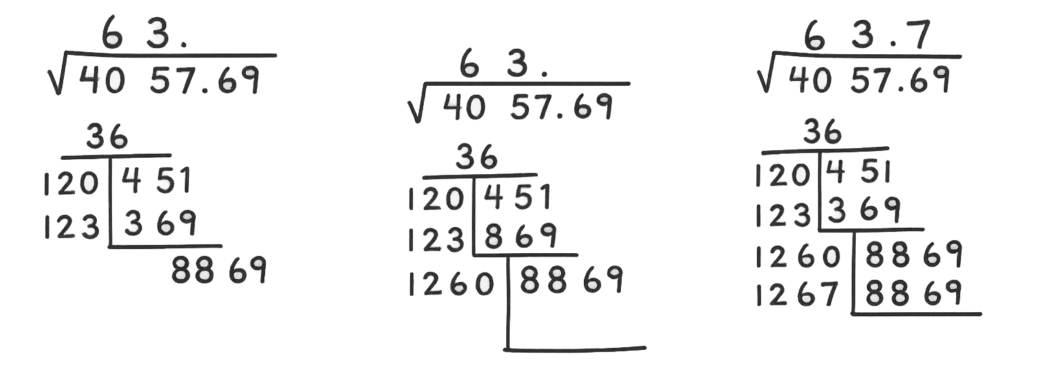 When I went to school in what seems now about a hundred years ago, we learned an algorithm for calculating square roots. Like the other rote procedures we learned — long division, solving quadratic equations, bisecting angles — we didn’t refer to the process as an algorithm. It was just another procedure whose steps we had to memorize. We used that square root algorithm to do many calculations, for example to show that √4057.69 = 63.7.
