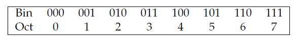 Octal (base 8) and hexadecimal (base 16) representation allow you to represent that number, and others like it, in briefer form. The reason those two bases are chosen is that they are closely related to binary in a way that decimal numbers are not. Consider first base 8. Here is a table showing the digits in base 8 compared with those in base 2:
