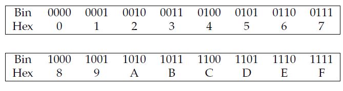 You can, moreover, shorten binary numbers still further by using hexadecimal or hex representation. The word hexadecimal means base 16.68 There is a problem with hexadecimal, however. Base 16 needs digits to represent numbers corresponding to the decimal numbers 0 to 15, and we have available only the ten digits of our decimal system. To address this problem, we simply continue with letters from the alphabet, counting 1,2,3,4,5,6,7,8,9,A,B,C,D,E,F,10. Here then is a table equating 4-digit binary numbers with their corresponding hexadecimal digits: