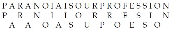 Children use various techniques to make their communications confidential — or more often simply part of an “in” language. Pig Latin is one such code.69 Another is splitting a message by the “rail fence” technique. Here is how you would encrypt the message, “Paranoia is our profession,” which, it has been suggested, should be the motto of the North American Defense Command: