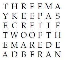 The very first military cryptographic device, the Scytale, was used by the Spartans as early as the seventh century BCE to encode and decode messages by a somewhat similar breakdown method. To illustrate this tool, here is how one of Benjamin Franklin’s aphorisms “Three may keep a secret when two of them are dead” is encrypted. The letters are broken into six rows of characters. (Five characters are added at the end to square off the array.)