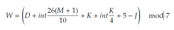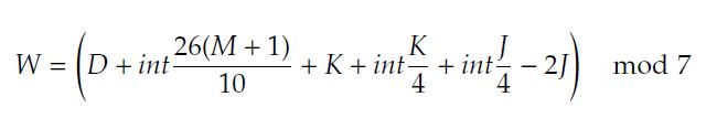 Not only is the formula complicated but some of the variables in it must be calculated. The variables are D: day of the month; M: month (3 = March, 4 = April, … 13 = January, 14 = February); K: year during any century; J: century (Thus, for the year 2016, J = 20, K = 16) and W: day of the week (0 for Saturday, 1 for Sunday, . . .)
