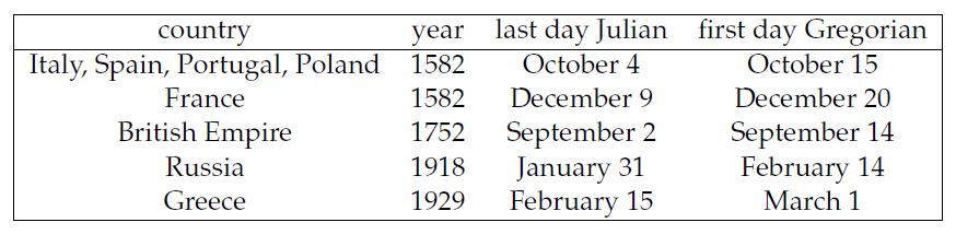 Historically, Pope Gregory XIII announced the new calendar that would be given his name on February 24, 1582. It replaced the slightly simpler Julian calendar, named for Julius Caesar, who decreed its use in 45 BCE, just one year before he was murdered on the Ides of March. Zeller’s congruence for the Julian calendar differs only slightly from the formula he introduced for the Gregorian calendar. It is: