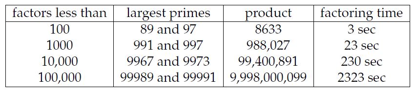 Our 10-digit calculators cannot continue this table, but you should see that things would increase dramatically if it could be extended with this same increasing tenfold factor. The relationship between the number of digits in the prime factors, n, and the time in seconds, t, is approximately t = 2.3 · 10n−2. Using this equation to calculate larger factors, here are some of the approximate times that would result:What that means is that, if a computer with the power of yours could handle 24-digit numbers, it would take over 700 years to find the prime factors of the number 999,999,999,950,000,000,000,429. A reasonable response to this is: Yes, but my computing device is small and this is a rather simple program. Big computers can calculate thousands of times, perhaps even millions of times, as fast. If your computer is 1,000 times as fast, it would still take 250 days to factor that number, 1,000,000 times as fast, still 6 hours. And indeed you could devise a more efficient program. Don’t miss the point here, however. Factoring with many-digit numbers takes a significant amount of time even with the most powerful computers. With a computer program like Mathematica you can multiply two 100-digit prime numbers in an instant, but it would take a great deal of time to factor the resulting 200-digit product even with the finest current technology.