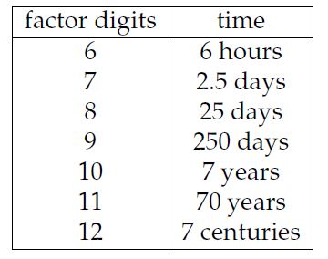 1. As the number of digits in the prime factors increases by 1, the time is multiplied by about 10. 2. For just 5-digit factors we have already reached over 38 minutes.