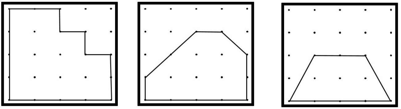 10a. The third figure is a trapezoid. The formula for the area of a trapezoid is \(A = \left( \frac{1}{2} b_1 + b_2 \right) h,\) where b1 is the length of one base and b2 is the length of the other base. In the problem above, b1 = 4 units, and b2 = 2 units. The height, h, is the length between the two bases. In the problem above, the height is 2 units. Show the formula, \(A = \left( \frac{1}{2} b_1 + b_2 \right) h,\) gives the same area as counting the squares.