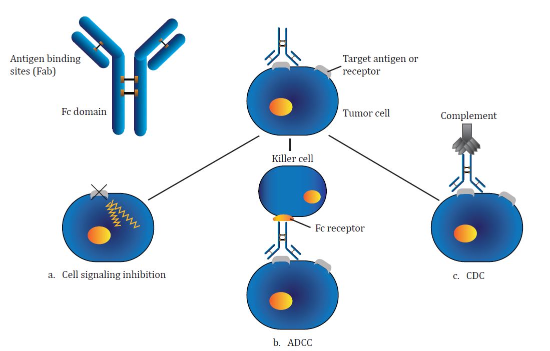 Mechanisms underlying the therapeutic efficacy of mAb-based immunotherapy. (a) mAbs can induce signaling inhibition and lead to apoptosis in targeted tumor cells by binding with their specific receptor, inducing modulation of the receptor or interfering with ligand binding and/or dimerization of the receptor. (b) The Fc region of an antibody recognizes the Fc gamma receptors (FcγR) on the surface of immune effector cells, while the Fab domain specifically bounds to a target cell. The FcγR ITAM is then phosphorylated, triggering the activation of the effector cell. (c) C1q binds to the antibody, triggering the complement cascade that leads to the formation of the membrane attack complex (MAC) (C5b to C9) on the surface of the target cell as a result of classic pathway complement activation.
