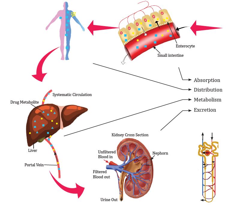 The human body is made up of cells. Neighboring cells with a similar function make a tissue. Each tissue has a small but well-defined role in the body. For example, epithelial tissue makes the boundary of a tissue and separates different tissue layers and organs in the body. Many different neighboring tissues often execute one bigger function of the body. These functional units of the body are called organs. For example, kidney, heart, liver, lung and skin are all organs with very well-defined functions in the body. Cells of all these organs are supplied with nutrition and oxygen and cleared off of their metabolic byproducts by the circulatory and lymphatic systems which are themselves considered organ systems. Just like nutrients and oxygen, drugs get distributed throughout the body through the circulatory system.