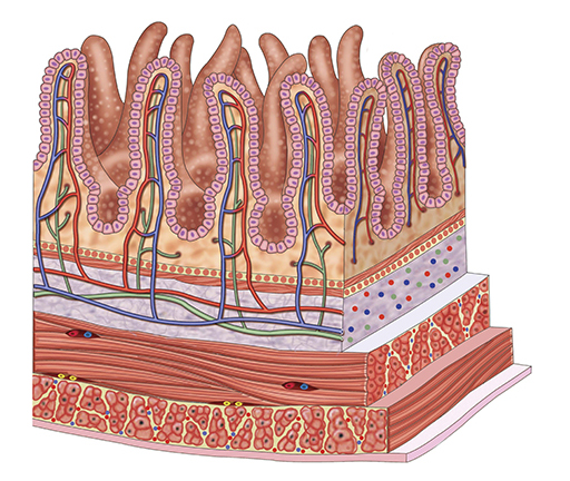 Absorption happens mostly in the small intestine. Unlike the stomach or the large intestine, the small intestine is full of small finger-like projections coming out of the internal epithelial lining called villi. The presence of these villis increase the area of absorption in the small intestine manyfold. As the drug molecules get absorbed from the GIT and go through the multiple layers of cells, they go through the plasma membrane many times. The rate of mass transfer through the plasma membrane each and every time is dictated by the physico-chemical properties of the particular drug molecule (like the ionic status and complexation or protein binding status). The rate of absorption of the drug molecule is thus not the same for each small molecular drug. Large molecular drugs like monoclonal antibodies do not get absorbed through the GIT membrane at all because of their size. They are typically given through the injectable route. Drug absorption is not always a phenomenon associated to the oral dosage form. Drugs given through the topical or intramuscular route have to go through the absorption process before they get into systemic circulation.