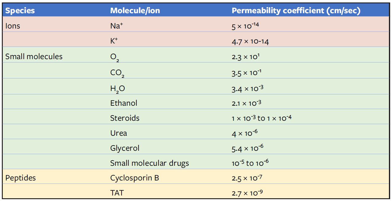 Permeation or trans-membrane diffusion is largely governed by two parameters; polarity and size. Small nonpolar gases like oxygen, carbon dioxide and nitrogen permeate through the plasma membrane rather fast. The permeability coefficient of uncharged molecules across the plasma membrane is largely a function of size. The permeability coefficient of uncharged molecules is inversely related to the molecular mass; it means that the bigger the molecule, the slower the permeability coefficient. The permeability coefficients of biologically relevant molecules and ions have been determined (Yang, N.J. and Hinner, M.J. 2014; Table 1). Small but relatively polar molecules like water and ethanol permeate through the cell membrane a little slower (10-3 cm/sec range). The permeability coefficient for slightly larger metabolites like urea and glycerol are a little slower (10-6 cm/sec range). Larger polar molecules and the charged ions virtually cannot permeate through the cell membrane.