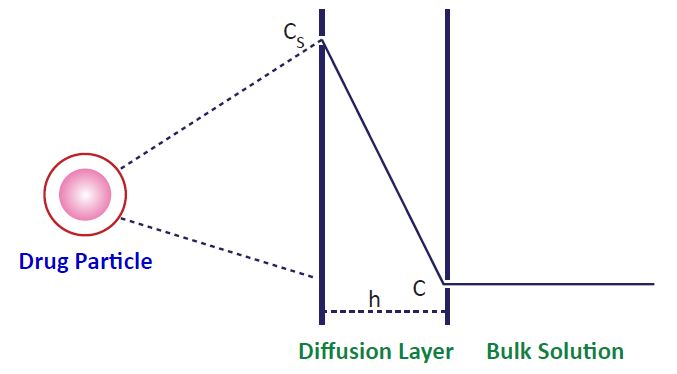 On the particle surface of the diffusion layer (with thickness h in the scheme), the concentration of the solute is the saturation concentration Cs, which is the property of the solute for that particular solvent. At the end of the diffusion layer, (at a distance h from the solute particle surface) the concentration is C, which is also the bulk concentration. The bulk concentration is zero at the beginning of the diffusion process and keeps on increasing as the time passes, with the highest possible concentration in bulk liquid being C = Cs. The solute concentration decreases sharply across the thickness of the diffusion layer. The following diffusion scheme is the basis of the Noyes-Whitney (proposed in1897) equation that quantitatively describes the dissolution process.
