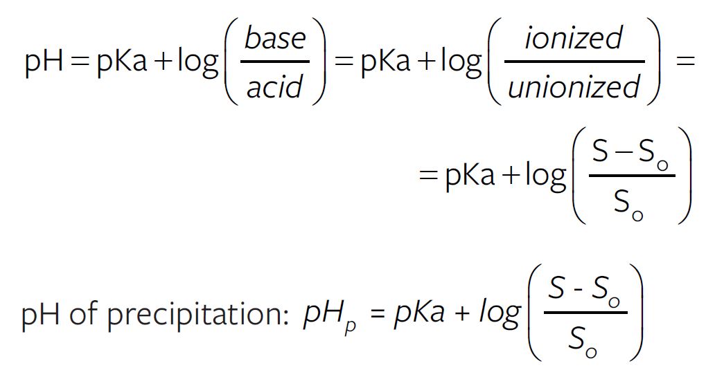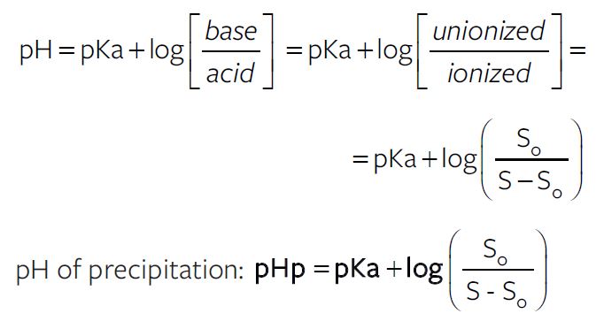 Most of the drug molecules are weak electrolytes i.e. weak acids and weak bases and their salts. As explained in the previous chapter (Ionic Equilibria and its Application), weak acids are almost completely unionized in pHs that are two log units below their respective pKas. The solubility of the weak acid at these low pHs are minimum and are called the molar solubility of the weak acid. Molar solubility is a property of the solute molecule/drug.