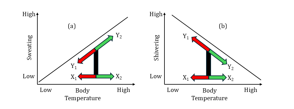 Recall in positive feedback, the body’s response to a stimulus moves in the same direction as the stimulus. In a positive relationship, the response variable (Y) changes in the same direction as the X variable. In our example of thermoregulation, if body temperature increases, then the amount of sweating increases too, whereas if body temperature decreases, then the amount of sweating decreases. Now you can say, “The amount of sweating is positively related to body temperature,” or “Body temperature has a positive effect on the amount of sweating.”