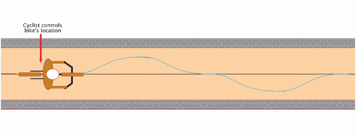 If the body’s reaction to a stimulus negates (opposes or counteracts) the stimulus, the process is negative feedback. In other words, when a stimulus changes the value of a regulated variable in one direction, negative feedback moves the value in the opposite direction. In this sense, being “negative” is a good thing because negative feedback prevents dramatic fluctuations in the values of regulated variables. If we plot the actual values for a regulated variable over time, negative feedback produces an oscillating pattern that might look something like the tire path in our bicycle analogy. In that figure, the rider demonstrates negative feedback control when trying to keep the bike on the line. When the bike veers left, the rider negates that movement by turning the handlebars to the right; when the bike veers right, the rider negates that movement by turning the handlebars to the left.