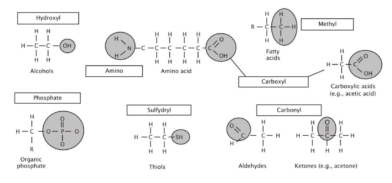 When organic compounds react with one another, only a small portion of each molecule actually interacts with the other molecule. The “reactant” part of an organic compound is a functional group. Think of a functional group as being responsible for an organic molecule’s reactivity in the same way that the outer electrons are responsible for a single atom’s reactivity. Examples of functional groups found in various organic compounds of the body include the hydroxyl (OH), amino (NH2), carboxyl (COOH), carbonyl (C=O), sulfhydryl (SH), methyl (CH3), and phosphate (PO4) groups. These major functional groups are highlighted in Figure 3-6.