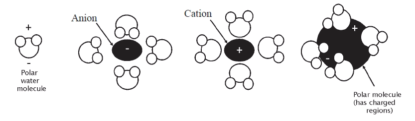 Figure 3-5. Hydration shells around ions and a polar molecule