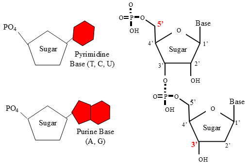 Due to covalent bonding, nucleotides can form a single-stranded polymer called a nucleic acid. A polymerase enzyme is responsible for bonding nucleotides together to form the nucleic acid. Note that the polymerase enzyme is a protein; therefore, it is also a polymer. One end of the nucleic acid or chain of nucleotides has a sugar molecule exposed and is called the 3’ (three-prime) end. The other end of the chain has a phosphate group exposed and is called the 5’ (five-prime) end. Remembering this will help you understand how polymerases construct nucleic acids.