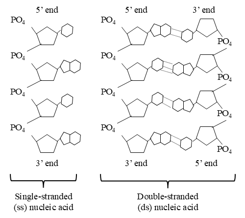 Due to hydrogen bonding between comple mentary base pairs, a single-stranded nucleic acid can either (1) fold back on itself to take on a more 3-dimensional shape, or (2) bond to another single-stranded nucleic acid to form a double-stranded nucleic acid (Figure 3-13).