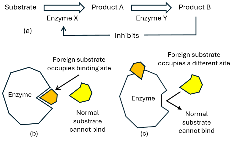 Figure 3-9. Enzyme inhibition. (a) End-product; (b) Competitive (c) Non-competitive (allosteric)