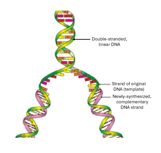 To understand how daughter cells produced during cell division will be genetically identical to one another, we need take a closer look at how DNA replicates itself. To some extent, DNA replication resembles gene transcription in which an enzyme uses the DNA molecule as a template when forming an RNA molecule. However, unlike transcription, which utilizes only one strand of the DNA’s double helix as a template, DNA replication utilizes both strands.