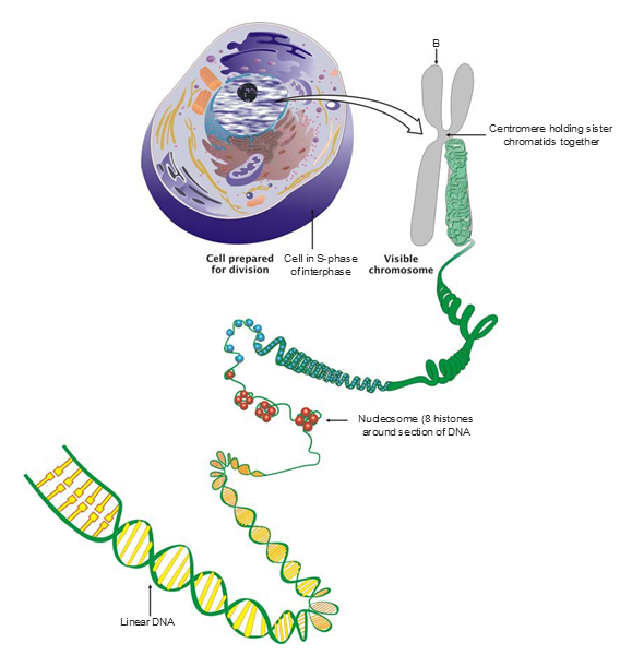 Genetic material consists of DNA and protein bound together in a way that allows it to exist either as fine, entangled threads during cell growth or as highly condensed, well-defined packages during cell division. The genetic material exists in the nucleus of a non-dividing cell as fine, intertwining threads called chromosomes (KRŌ-mō-somz; chromo, color; somes, bodies). The structural material that comprises a chromosome is chromatin (KRŌ-ma-tin), so-named because it appears dark when stained with certain dyes. A closer look at chromatin reveals that it is a complex union between DNA and a group of globular proteins called histones (HIS-tōnz). Histone proteins look like small marbles and bunch together in groups of eight. A short segment of a double helix DNA molecule wraps around these clusters of histones, much like a thread wraps around a spool. The entire DNA-histone complex resembles a beaded necklace, in which each “bead” is a nucleosome (NŪ-klē-ō-sōm). Figure 5-2 shows the structure of a nuclear chromosome.