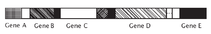 Each DNA molecule in the nucleus consists of functional segments called genes (jēnz) that provide a chemical code specifying the number, type, and arrangement (sequence) of amino acids in proteins. The word gene implies that information within these segments of DNA can be used to generate proteins. Recall that two or more amino acids linked together comprise a peptide; therefore, since proteins consist of many amino acids, biochemists refer to them as polypeptides. Biochemists have determined that genes contain chemical instructions necessary to synthesize polypeptides, and this concept became the one gene-one polypeptide theory. All the genes on all the different types of chromosomes in your cells make up your genome (je-NŌM). An example of how genes might align on a chromosome is shown in Figure 5-3. The small segments that have no labels represent “promoters” and other regions not encoded directly onto RNA molecules. The names of actual genes would be written in italics using lowercase letters; e.g., genes that code for the enzymes sucrase and lactase might be written suc and lac, respectively. The Human Genome Project is attempting to identify every gene on every chromosome in the human species. Identifying gene location would allow researchers and clinicians to know which genes are “linked” (located on the same chromosome) and might allow defective genes to be replaced.