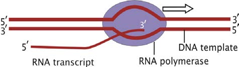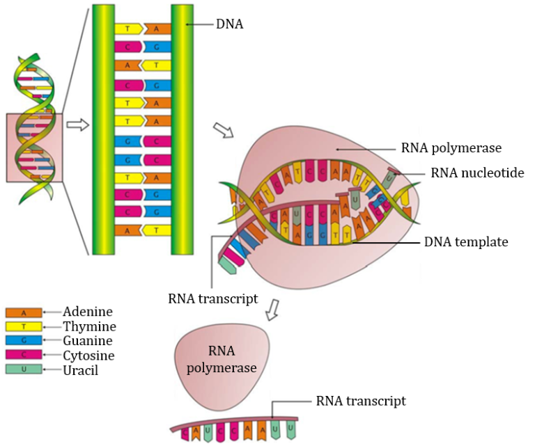 Transcription stops when the RNA polymerase comes to a region of the gene called the terminator. Reaching the terminator causes RNA polymerase to detach from the DNA template and release the newly formed RNA molecule, called an RNA transcript. Let’s now look at the three types of RNA generated by transcription.