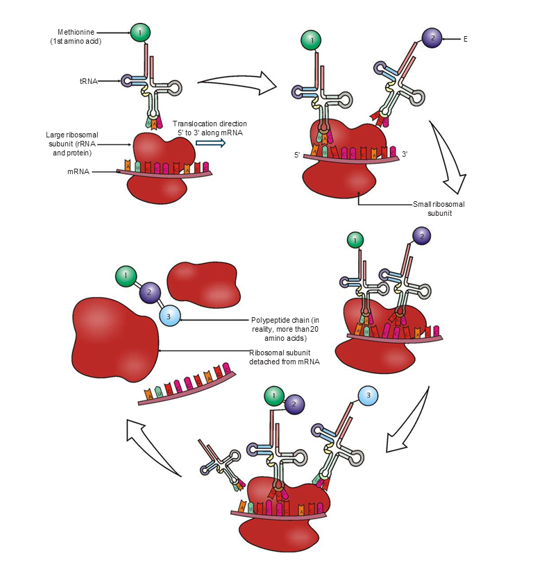 Translation occurs in the cytoplasm and involves the collective efforts of mRNA, tRNA, and small and large ribosomal subunits. Before translation begins, mRNA molecules and the ribosomal subunits exit the nucleus through nuclear pores in the nuclear membrane. In the cytoplasm, the ribosomal subunits come together around the mRNA to form a functional ribosome. The mRNA then shifts through the ribosome one codon at a time. Each time the mRNA shifts, a tRNA molecule brings in the next amino acid specified by the codon occupying a precise location within the ribosome. Within the ribosome-mRNA complex, a covalent bond forms between two adjacent amino acids so that the ribosome builds a protein one amino acid at a time. Translation involves five major steps (see Figure 5-7 and the description of each step that follows).