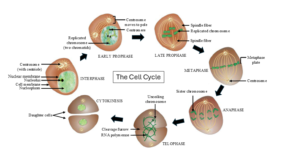 A human body can grow, replace damaged and worn-out cells, and experience cellular differentiation only because many of its cells can reproduce themselves. Cell division, or cellular reproduction, results when a cell splits to form two new cells called daughter cells. The series of events that occur in the life of a typical cell from the moment it forms until it divides comprise the cell cycle. The word “cycle” implies a return to a beginning point; in the cell cycle, daughter cells grow and divide producing more daughter cells, which in turn, grow and divide, and so on. A few types of cells, including neurons and skeletal muscle cells, do not divide; therefore, they do not go through a cell cycle.