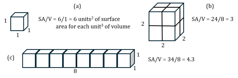 In Figure 5-8, you can see the effects of different sizes and shapes on there are different you can see the effect of increasing size on the SA/V ratio. For part (a), a small cell is 1 unit long on each side, so its SA is 1 x 1 x 6 sides = 6 square units (written 6 units2), while its volume is 1 x 1 x 1 = 1 cubit unit (written 1 unit3). Therefore, its SA/V ratio is 6, meaning it has 6 units2 available for each unit3 of volume (or mass). For part (b), the SA is 24 units2 and the V is 8 units3, so the SA/V = 3, that is, it has 3 units2 of SA for each unit3 of volume. We can take the same 8 units3 of volume from part (b) and arrange the blocks in a row and not change the volume. However, the SA of this arrangement (shape) is now 34 instead of 24.