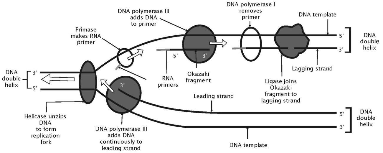DNA polymerase can move along a DNA template only toward the template’s 5’ end; therefore, synthesis of a new DNA polymer occurs only in a 5’ to 3’ direction. As Figure 5-10 shows, one template is replicated continuously in the direction of the replication fork; the new DNA polymer formed on this template is called the leading strand. The other template is replicated in short segments, called Okazaki (ō-ka-SOK-ē) fragments, away from the replication fork, but still in a 5’ to 3’ direction. The new DNA polymer formed on this template is the lagging strand. Before Okazaki fragments can join together to elongate the lagging strand, a different polymerase, DNA polymerase I, must first remove the RNA primers. After this happens, yet another enzyme, DNA ligase (LI.-gās; liga, to join), must move in to join the Okazaki fragment to the lagging strand. Figure 5-11 shows the role of the major enzymes used in DNA replication.