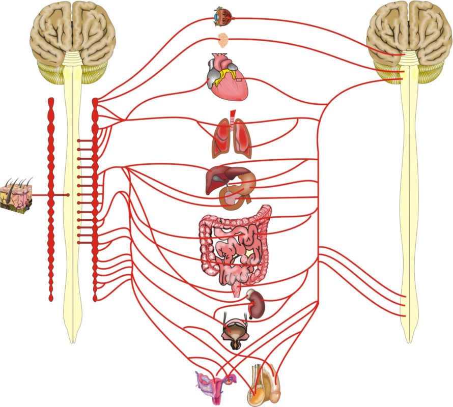 The sympathetic division has two other names based on its major associated functions and the location where its preganglionic neurons exit the dorsal cavity. Functionally, the sympathetic system is the nervous system’s fight-or-flight division because its activity increases during times of physical and emotional stress, including exercise, anxiety, trauma, etc. It is also the thoracolumbar division (thorak-ō-LUM-bar) because its impulses exit the dorsal cavity only in the thoracic and lumbar regions (Figure 19 3).