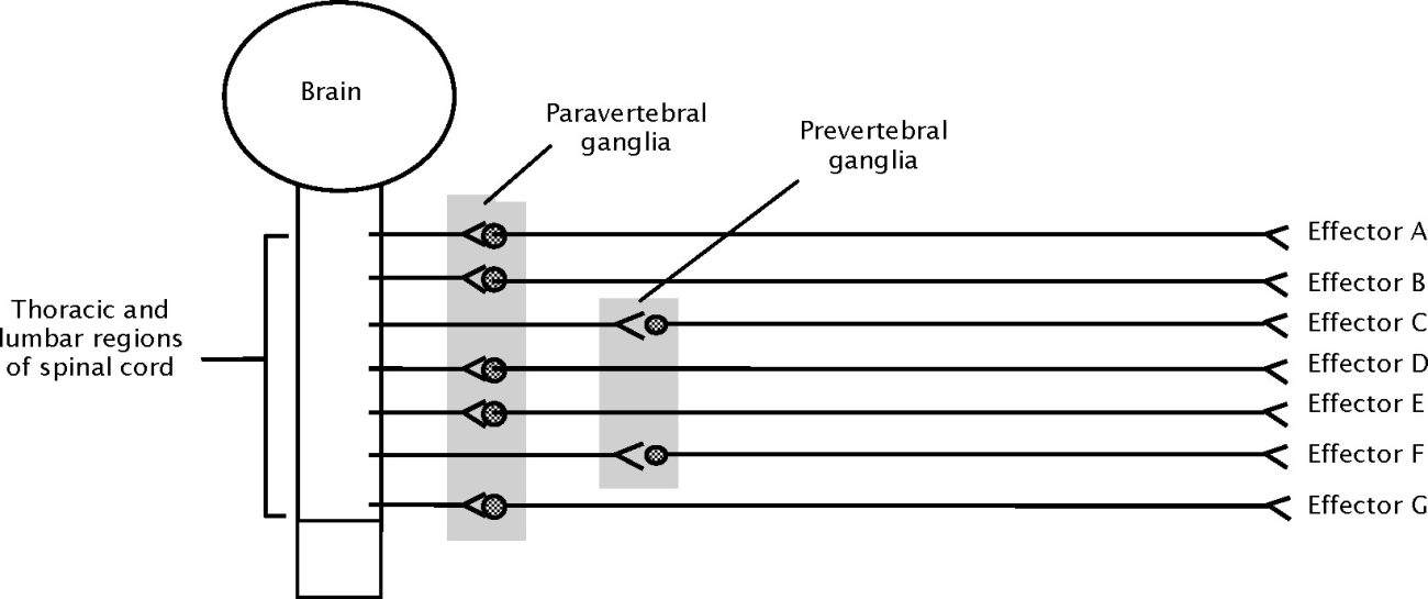 The cell bodies of sympathetic, preganglionic neurons reside in the lateral horns of the spinal cord. The axons of these neurons exit the cord through thoracic or lumbar spinal nerves and pass through paravertebral ganglia (para-VER-te- bral), so-named because they are located alongside the vertebrae. There are 23 paravertebral ganglia aligned like a “chain of beads” on each side of the vertebral column. A preganglionic axon may synapse with a postganglionic neuron in a paravertebral ganglion, or it may pass through the paravertebral ganglia and synapse in a prevertebral ganglion (prē-VER-te-bral), so- named because it is anterior to (pre-, before) the vertebrae. Whether or not a sympathetic impulse passes through more than one paravertebral or prevertebral ganglion, it will pass along no more than two axons before reaching its effector.