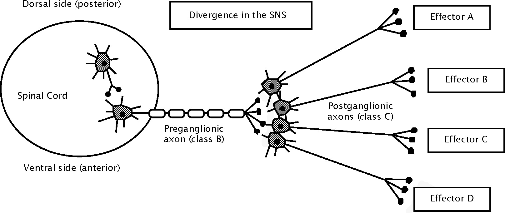 It is often important for autonomic signals to reach a great number of effectors in a short amount of time. To facilitate this, one preganglionic neuron may synapse with more than one postganglionic neuron within a ganglion; this pattern of impulse flow is called divergence (dī-VER-jens) (Figure 19-4). While divergence is a part of both divisions of the ANS, it is more extensive and common in the sympathetic division. Divergence allows sympathetic impulses to “spread out” to numerous effectors more rapidly, which is an obvious advantage when one considers certain fight-or- flight responses.