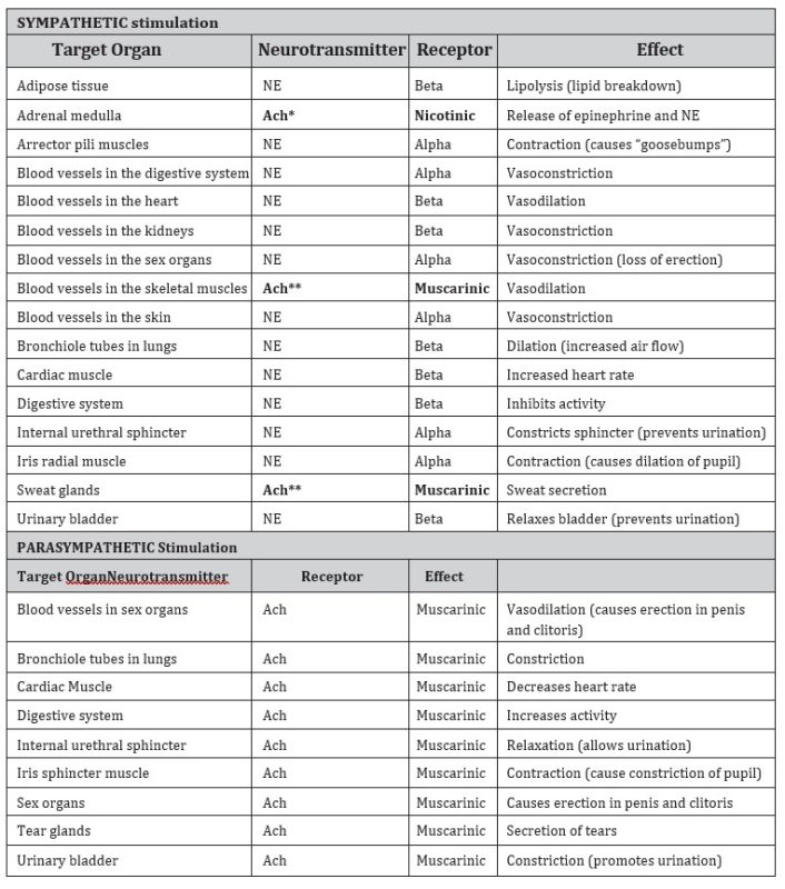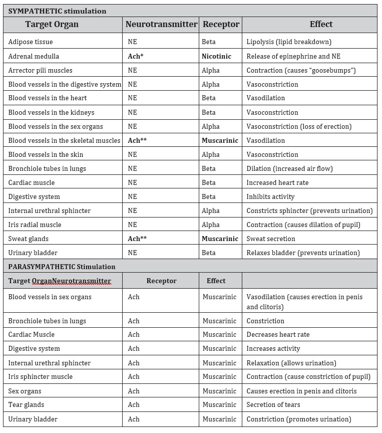 include the sweat glands, some blood vessels coursing through skeletal muscles, and the adrenal medulla (the inner core part of the adrenal gland). However, the adrenal gland receives Ach stimulation directly from a preganglionic neuron. In response, the adrenal gland secretes the hormones epinephrine and norepinephrine; thus, the adrenal gland functions much like a typical postganglionic neuron in the sympathetic division. Epinephrine and norepinephrine usually promote similar effects on the same target organs.
