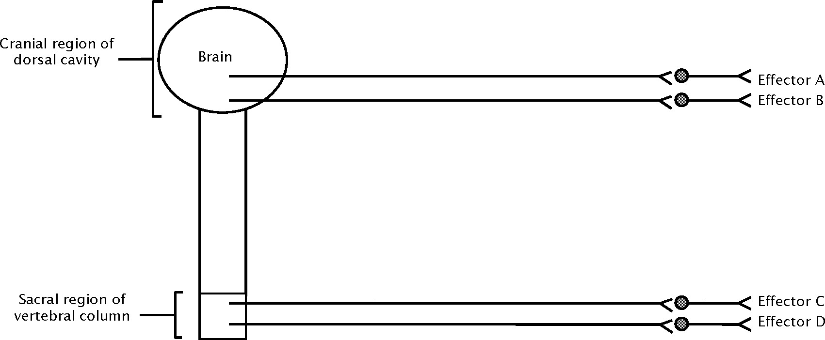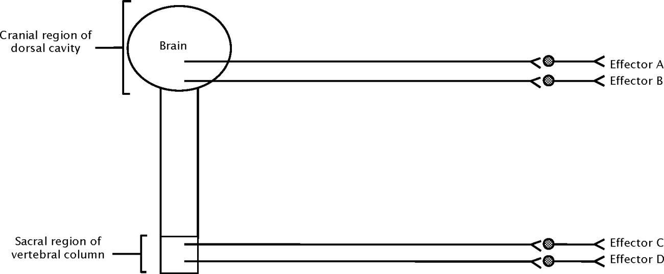 Like the sympathetic division, the parasympathetic division has two other names based on its major associated functions and the location where its preganglionic neurons exit the dorsal cavity. Functionally, the parasympathetic system is the nervous system’s rest-and-digest division because its activity increases during times of rest, relaxation, and digestion. It is also the craniosacral division (krā-nē-ō-SĀ-kral) because its impulses exit the dorsal cavity only in the cranium (which houses the brain) and the sacral regions (Figure 19-5).