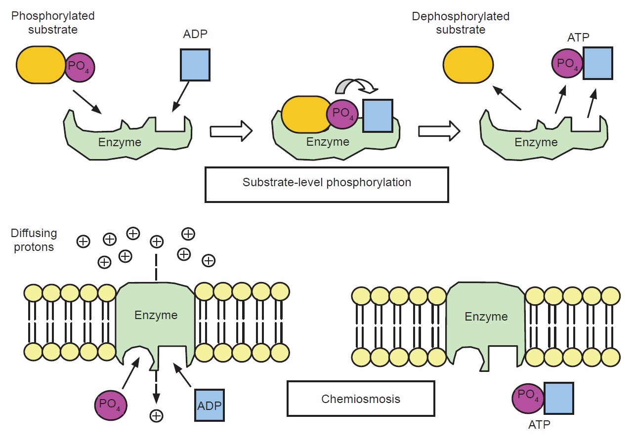 To make ATP, cells must phosphorylate ADP (adenosine diphosphate), and this process requires energy, which the cells derive from food molecules. While the extraction of energy from food molecules may involve multiple, complicated chemical reactions, the phosphorylation of ADP occurs in only two ways: substrate-level phosphorylation and chemiosmosis (see Figure 21-1).
