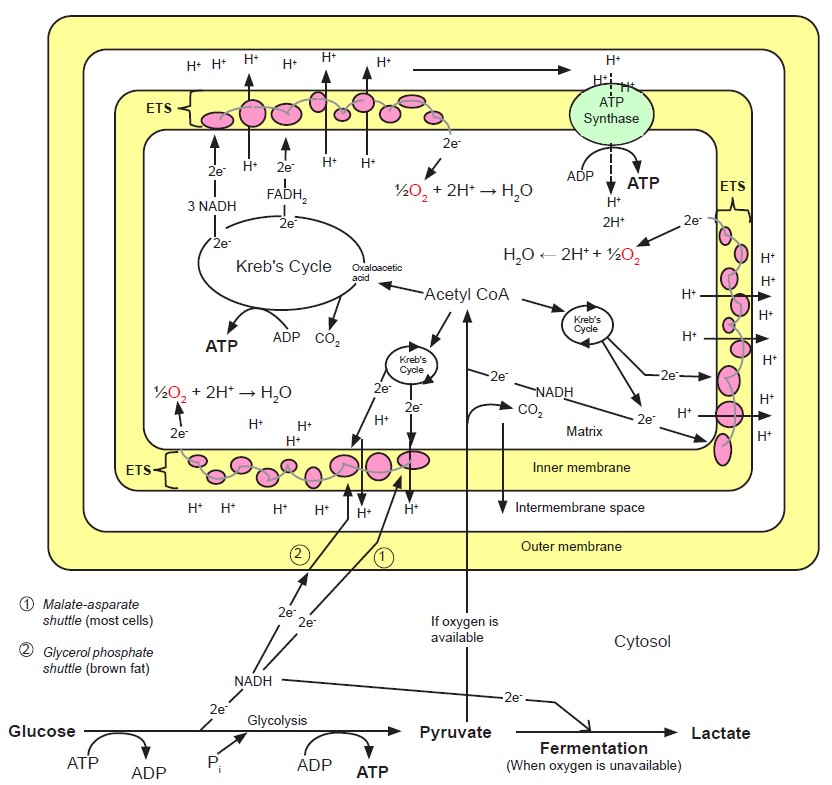 Mitochondrial NADH, FADH2, and cytosolic NADH donate their electrons to different parts of the ETC, and thus energize different numbers of proton pumps. Mitochondrial NADH always donates its electrons to complex I. Since these electrons pass along the entire ETC, they can energize all three proton pumps (complexes I, III, and IV). Electrons from FADH2 enter complex III, so they can energize only the last two proton pumps (III and IV). The NADH molecules from glycolysis cannot enter the mitochondrion, but “hand off” their electron cargo to a “shuttle” molecule in the inner membrane of the mitochondrion. In most body cells, a malate-aspartate shuttle (MAL-āt AS-par-tāt) hands off these electrons to complex I, so they can energize all proton pumps in the ETC. Brown fat cells, however, use a glycerol phosphate shuttle (GLI-ser-ol), which passes the electrons to FAD within complex II; consequently, these electrons can energize only the last two proton pumps.