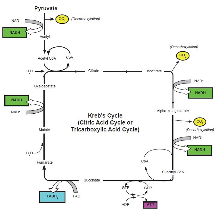 The ETC includes a number of proteins, some of which are coupled together with other compounds to form complexes. There are four complexes in the ETC, and each is identified by a Roman numeral (I, II, III, IV). The FAD that accepts electrons from the Krebs cycle is actually a part of complex II. Following is the pathway followed by the electrons donated to the ETC. You are not expected to memorize these steps, but you must be able to associate the names in boldface with the ETC.