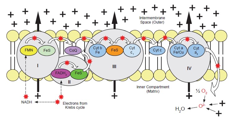 - Within complex I, FMN passes the electrons to an iron-sulfur protein (FeS), reducing the ferric iron (Fe3–) to the ferrous form (Fe2+). Passing electrons through complex-I energizes the complex, enabling it to function as a proton pump, which transports two protons (i.e., two hydrogen ions—2H+) from the mitochondrial matrix through the inner membrane and into the intermembrane Meanwhile, 2e– released from the Kreb’s cycle bind to FAD located with complex II, converting the FAD to FADH2. Still within complex II, the FADH2 passes the 2e– to the Fe-S protein, converting the FADH2 back to FAD.