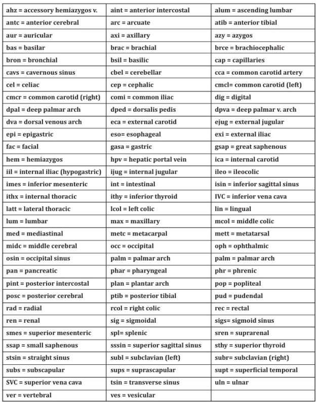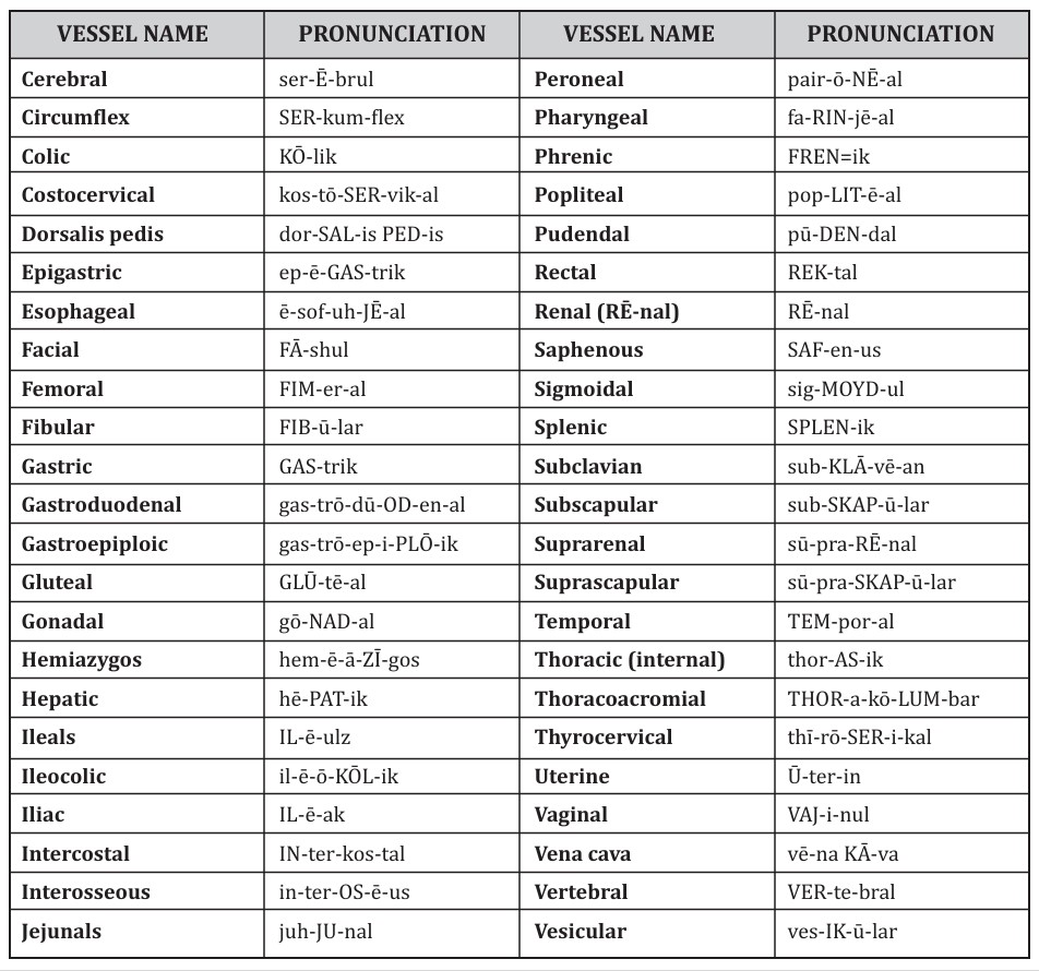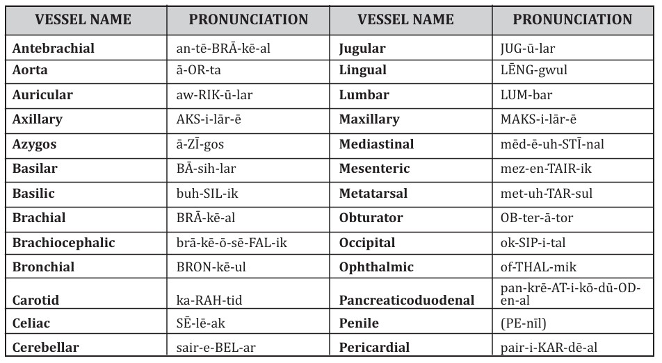 Thus, the focus of this chapter will be on other vessels in the systemic circulation. As you work through the following tables, you will notice that many of the names are similar to names you learned for various body regions and organs. Since some of names may be unfamiliar, a pronunciation guide is provided in Table 1.