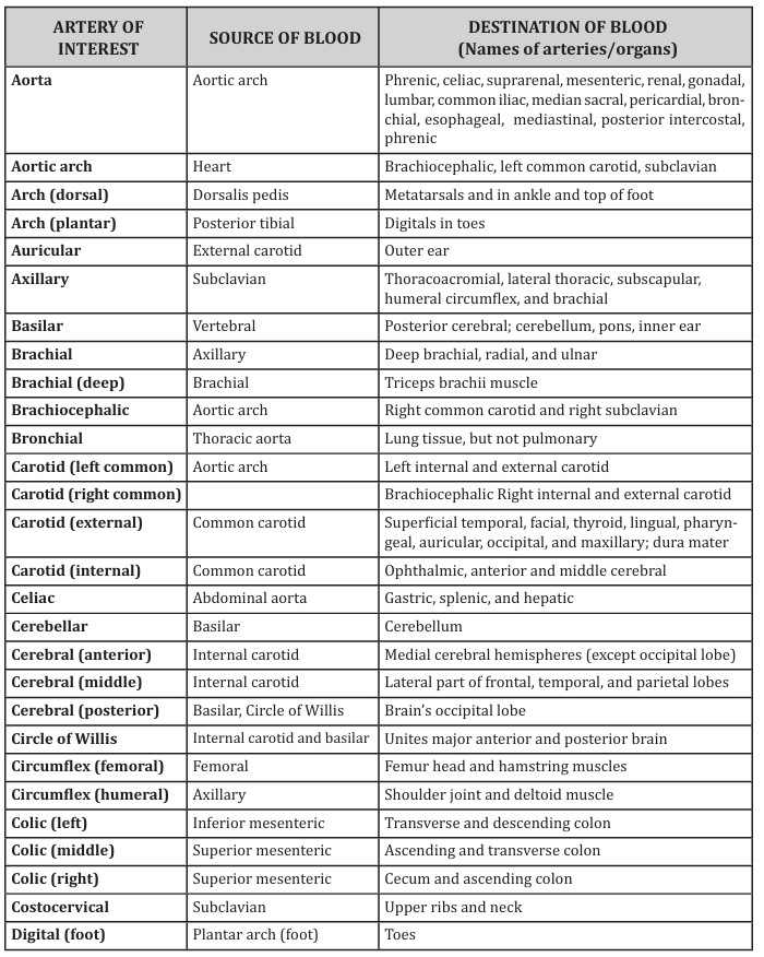We will first look at the body’s major systemic arteries, which conduct oxygenated blood from the heart to tissues throughout the body, with the exception of vessels fed and drained by the pulmonary arteries and veins, respectively. Table 2 lists the major systemic arteries in the left col umn in alphabetical order. You should be able to identify these arteries on models, diagrams, and other sources provided in lab.