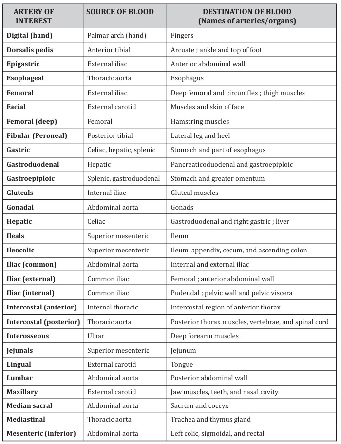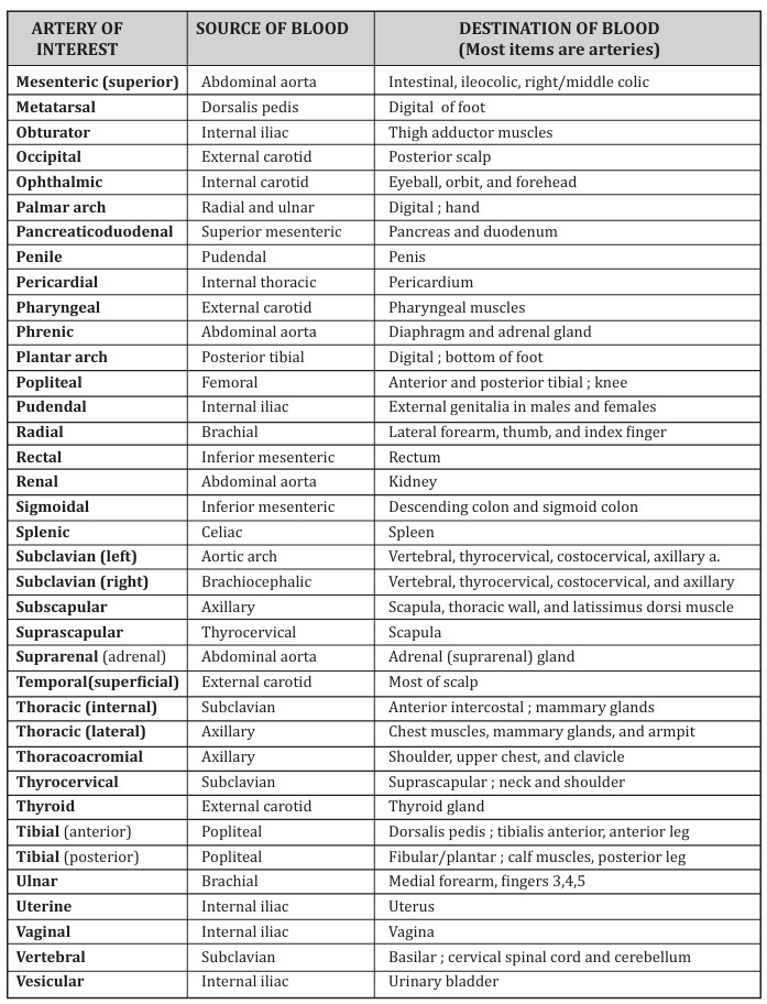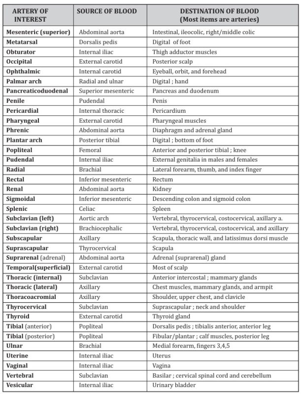 Additionally, for each artery, you should be able to state (1) its location, (2) source of blood (i.e., arteries that feed blood into the artery of interest), and (3) the vessels to which the artery of interest feeds blood (i.e., the destination of blood in the artery of interest). Figures 26-1 and 26-3 show some of the arteries listed in Table 2, but in the lab, you will be provided more diagrams showing the other arteries.