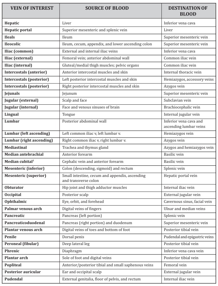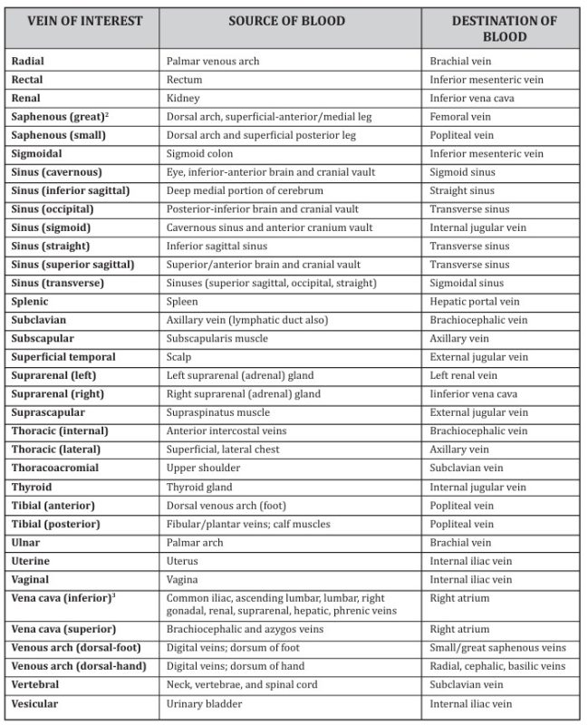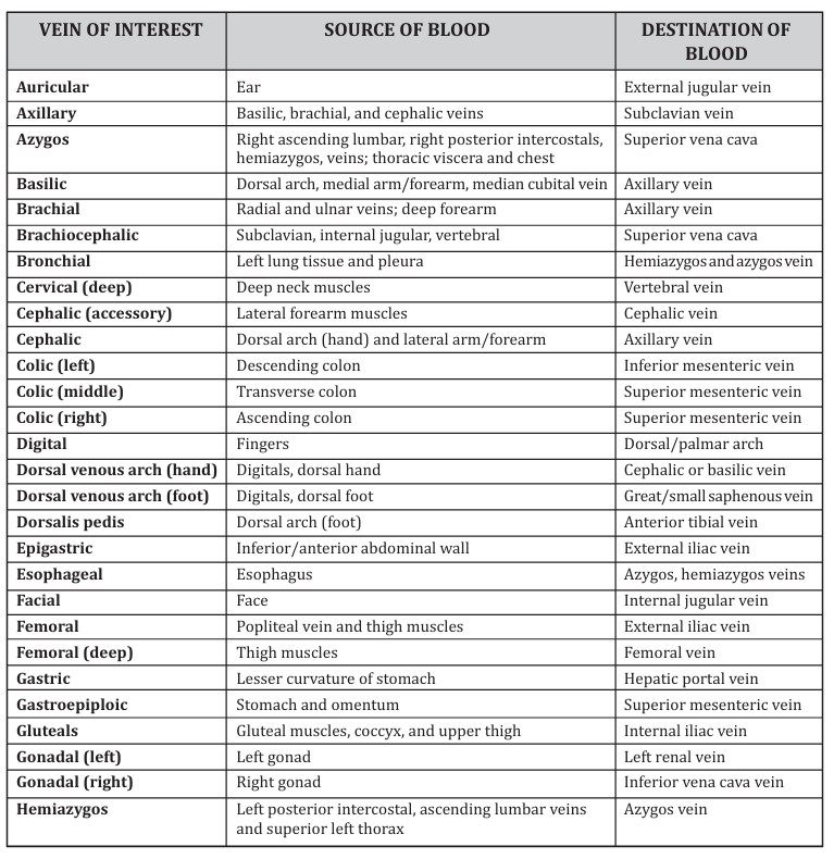 Table 3 lists ma jor systemic veins in alphabetical order, and like the arteries, you should be able to identify these vessels on models, diagrams, and various other sources provided in lab. For each vein, you should be able to discuss (1) its location, (2) source of blood (vein or organ that feeds the vein of inter est), and (3) the vessels to which they feed blood (destination of blood). Figures 26-2 and 26-4 show some of the veins listed in the table. You will be provided more diagrams in lab