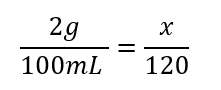 You would then solve x by multiplying the 2 and 120 which would give 240 g*mL and then divide by 100 mL to get 2.4g which is the answer. In this problem we used conversion of a percentage to a fraction to solve the problem.