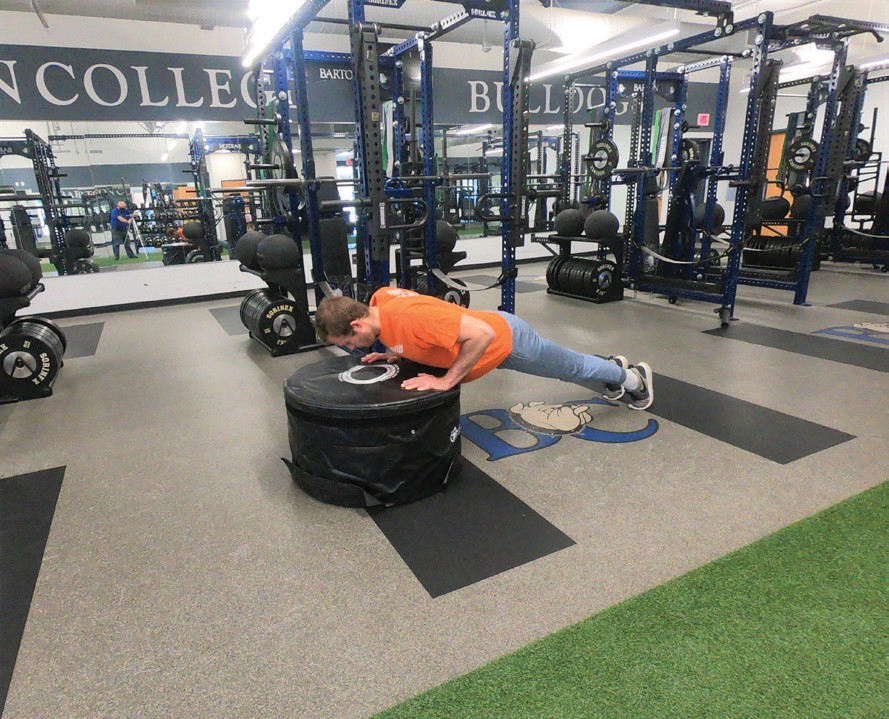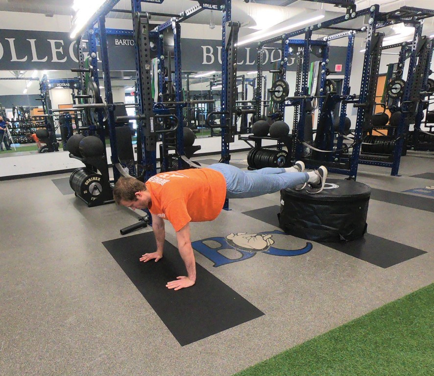 Elevate the feet and maintain a good plank body position as you perform push-ups.