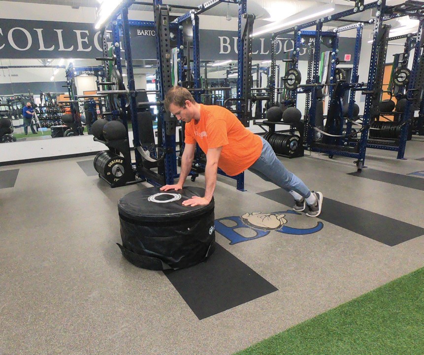 Place hands on object and perform push-ups at a comfortable body angle (as you reduce the incline, getting closer to a push up on the ground, the more body weight being worked against)