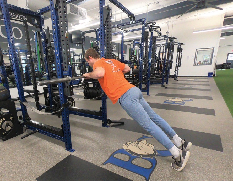 Place hands on bar and perform push-ups at a comfortable body angle (as you reduce the incline, getting closer to a push up on the ground, the more body weight being worked against)